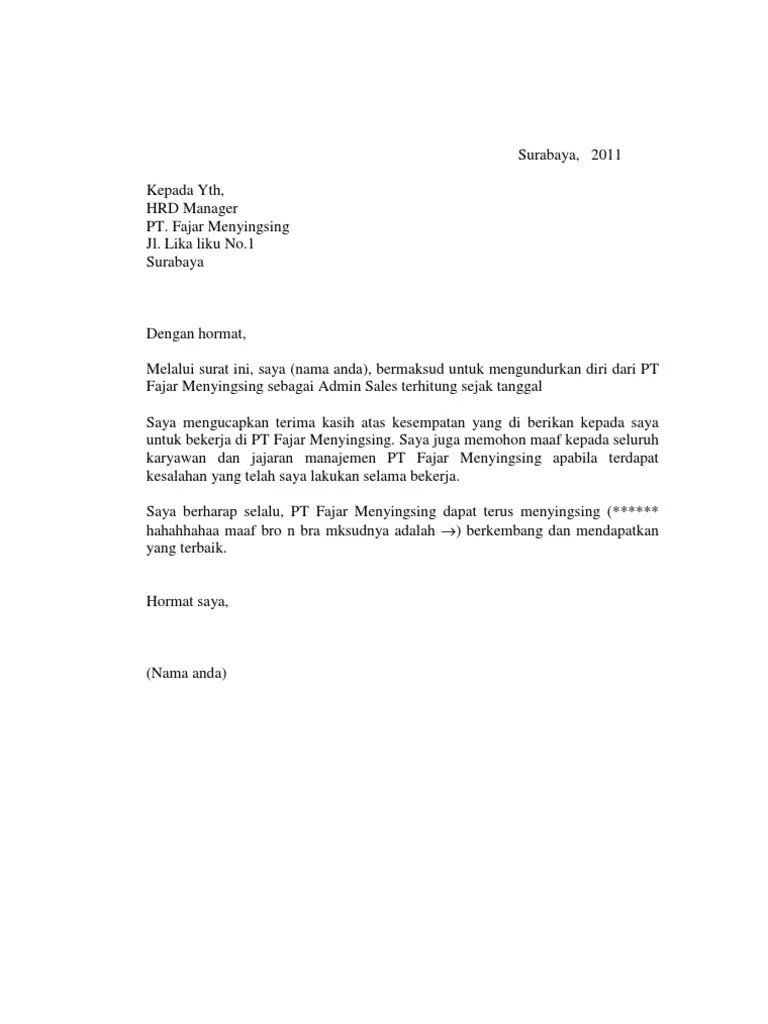 Surat pengunduran diri adalah surat untuk menyatakan bahwa dirinya berhenti bekerja dari tempat di mana dia bekerja, dengan alasan yang . Format doc yang dapat diedit langsung menggunakan microsoft word . 3 contoh surat pengunduran diri kerja, perusahaan, . Negeri sipil di lingkungan kementerian riset, teknologi, . Nah, jika kamu ingin mengundurkan diri dari pekerjaan atau jabatan kamu saat ini, kamu bisa pelajari format dan contoh surat .